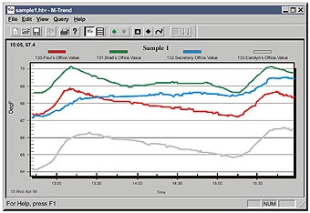 M-Trend дает оператору возможность просмотра статистических данных о работе каждого элемента системы управления зданием, которые могут быть выведены на экран рабочей станции как в графической, так и в табличной форме. Существует два способа сбора статистических данных о системе. Как правило, статистическая информация буферизуется в контроллерах и с определенной периодичностью сохраняется в один или несколько файлов архива. Если ситуация на определенном участке системы управления зданием изменяется динамически и нужно немедленно получить данные о работе системы, то оператор может делать временные срезы параметров работающих компонентов с помощью специальной функции. С помощью M-Trend диспетчер может оптимизировать расход электроэнергии и диагностировать возможные проблемы с оборудованием до их появления, благодаря чему расходы на устранение неполадок могут быть существенно снижены.