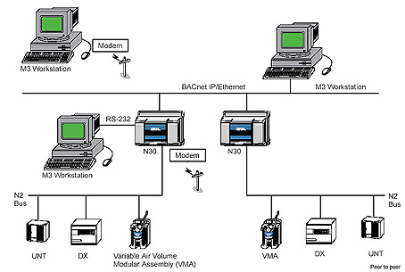 Система управления зданием Metasys предусматривает два варианта подключения рабочей станции M3 Workstation к контуру управления оборудованием: